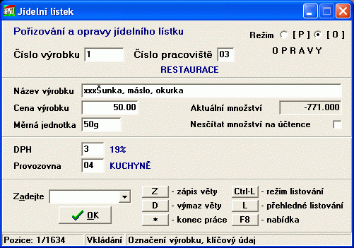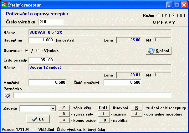 Stavba receptury probíhá tak, že se vybere z jídelního lísku výrobek, a k němu se postupně zadávají jednotlivé suroviny.